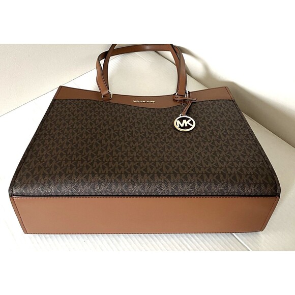 New Michael Kors Jet Set Travel Large Signature Logo Pocket Tote Brown Multi