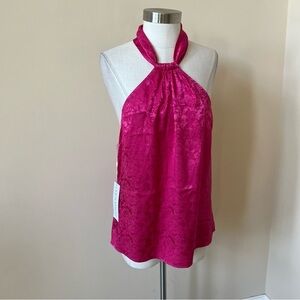Claire Top in pink with satin jacquard design, halter neck, and open back