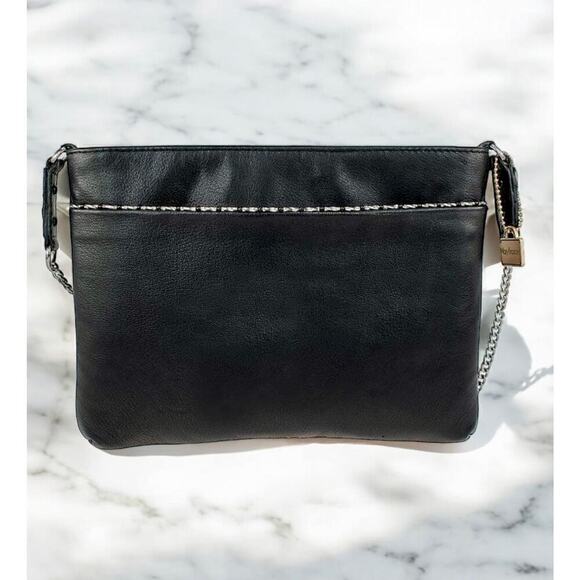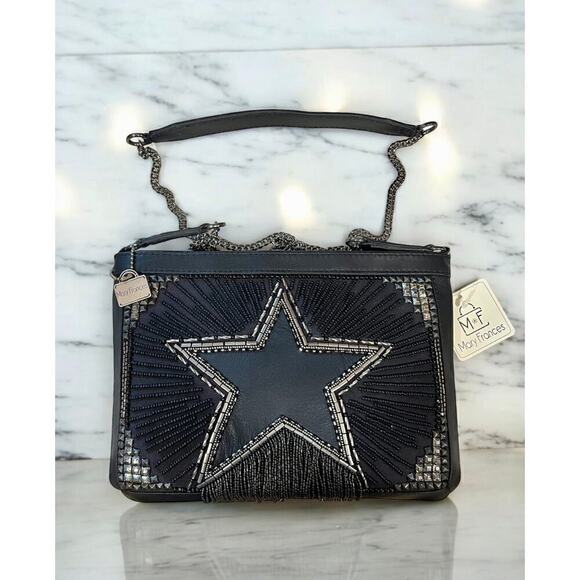 This New With Tags Mary Frances Stellar bag is just exquisite! Featuring black leather with a hand beaded Star motif with silver and gun metal gray studs/beading and beaded fringe trim. This bag is perfect for a night on the town or when you want to make a statement! Can be worn as a crossbody or shoulder bag.