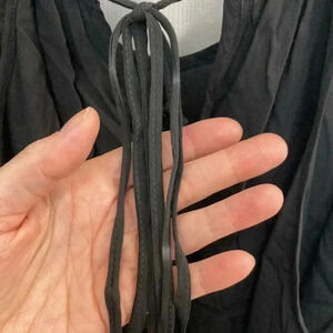100% rayon but feels like silk! Delicate, adjustable straps. Raw hemline and lace trims. Cropped style. This is an environmentally responsible brand sold at Nordstrom’s.