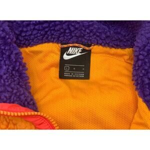 Embrace bold style and ultimate comfort with this Nike ACG Sherpa Fleece Pullover Jacket. Designed in a vibrant orange and purple color block pattern, this piece is perfect for outdoor adventures or making a statement in cooler weather. The cozy sherpa fleece keeps you warm, while the half-zip front allows for adjustable ventilation. Featuring a kangaroo pocket for convenience and the iconic Nike logo embroidered on the chest, this jacket combines functionality and fashion effortlessly.