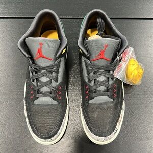 Nike Air Jordan 3 Retro SE Animal Instinct 2.0 in size 10. The Nike Air Jordan 3 Retro revisits the "Animal Instinct" design and gives it an upgrade. This time around, the 2.0 version features reptilian-inspired prints all over the upper. Splashes of green, yellow and red further completes the look. Brand new in box! Shoes were used as display for short time, never even tried on. Very minor marks on the bottom of one sole. Not sure how the spots on the bottom happened, but it is the only flaw and it’s on the bottom of the sole.