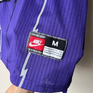 Iconic purple Toronto Raptors jersey featuring the classic dinosaur graphic on the front and "McGrady #1" on the back. Official Nike NBA design with bold red, black, and silver details. Men’s size Medium - 22" pit to pit; 31" length.