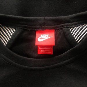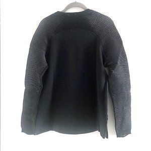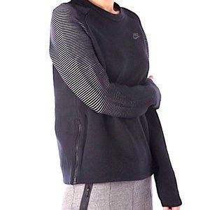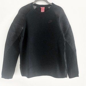 This Nike tech black sweatshirt has cool textured accordion sleeve detailing that looks like black and white stripes in movement. Crew neck with side zippers. Worn once and in excellent condition.