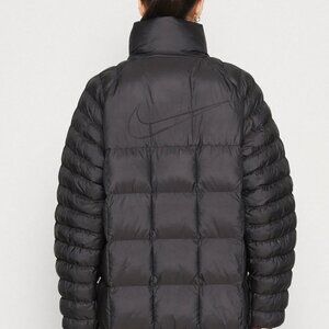 Elevate your winter wardrobe with this Nike Sportswear Swoosh parka. The black jacket features an embossed logo, quilted accents, and a full zip closure with snaps. The high collar and oversized fit provide extra warmth and comfort, while the long sleeves and pockets keep your essentials safe and secure. Perfect for travel, workwear, or casual wear, this jacket is a versatile addition to any streetwear or athleisure outfit. Machine washable and made with durable polyester material, this Nike puffer is a reliable choice for any outdoor adventure.