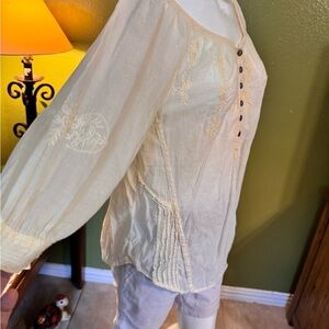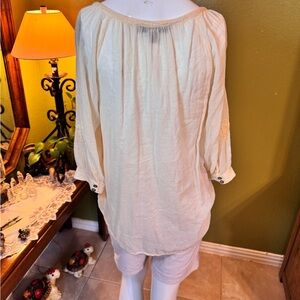 This relaxed cream blouse from Nine West features a comfortable 3/4 sleeve design and a classic buttoned style. Its lightweight fabric and flowing fit make it a versatile choice for both casual and dressier occasions. Fairly used and in great condition! Open to offers