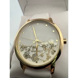 Stylish quartz analog watch with gold-tone case and floral-accented dial, white faux-leather strap.