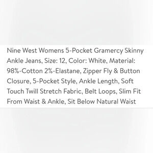 Nine West Gramercy Skinny Ankle Soft Twill Jeans. Size 4.In good used condition has small light spots of discoloration as seen in pictures but nothing very noticeable. Still very white jeansTags: vintage boho christmas winter fall cute petite revovle free people nordstrom asos h&m forever 21 holiday seasonal urban outfitters warm cozy made in italy luxury valentines day love