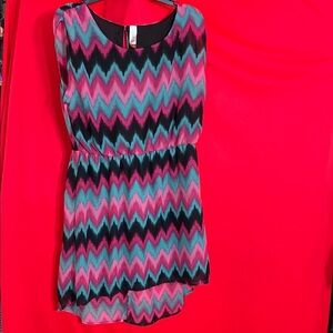 Stylish dress with a vibrant chevron pattern. Features pink, blue, and black colors.