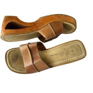 Stylish brown leather slide sandals with a comfortable wooden sole. Perfect for casual wear.