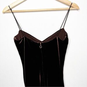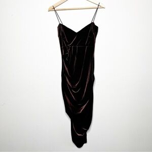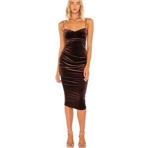 Nookie Rumi Midi Dress in Chocolate Velvet Ruched Sides Stretch Shoulder Straps