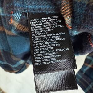 The North Face heavy flannel button down shirt in navy blue plaid. Cotton shell with a polyester lining for light warmth, chest pockets, button front, and adjustable cuffs. An easy town-to-trail layer for workdays and weekends.