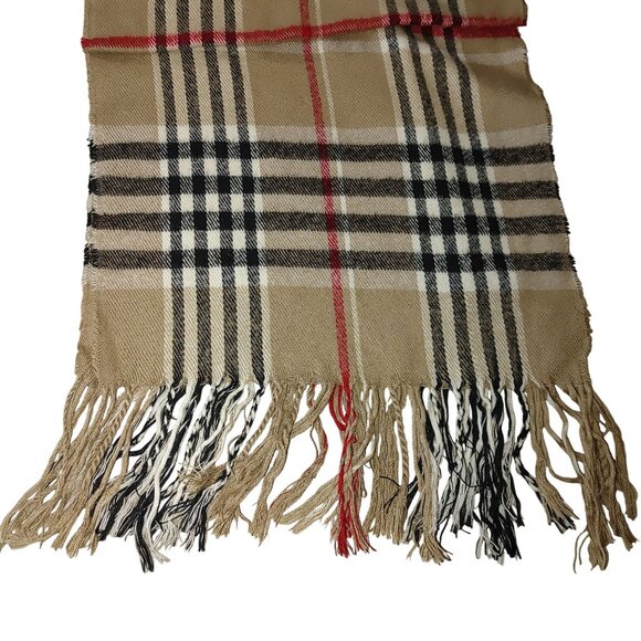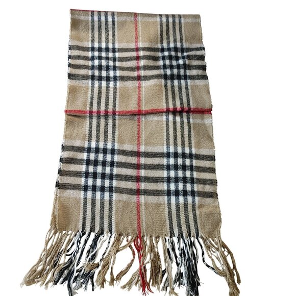 This scarf exudes timeless sophistication with its classic beige plaid design, accented by red and black checks. Crafted for warmth and style, the soft texture and fringed edges make it an essential accessory for chilly days. Its versatile length lends itself to various draping styles, ensuring both comfort and elegance.