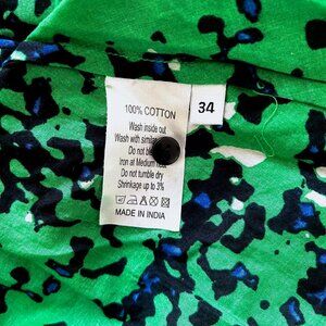 This lightweight cotton dress in a beautiful green print from Danish brand, Nué Notes, is perfect for summer. Featuring a sleeveless style with an A-line silhouette, button closure at the chest and an adjustable tie strap at the waist. Crafted in a lightweight 100% cotton material that will keep you stylish and cool on warm summer days. Unlined. Size is a Danish size 34 (translates to an x-small to small). See measurements below. Worn a few times and in great pre-owned condition. Note that there is a small white spot on the back collar that’s hardly noticeable.