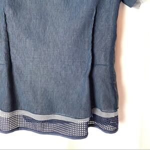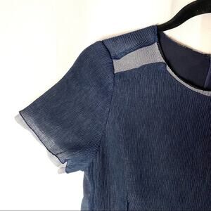 Excellent used condition! Beautiful short sleeved blouse with light layers of different textures. Navy blue and gray. Puckered and gathered waist. Back zip closure. Chiffon overlay. Fully lined.