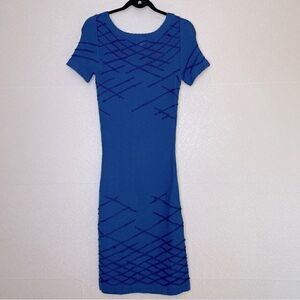 •Features: Blue hand knit dress with navy blue embroidered detail. Body con fit. Hidden side zipper. Fabric has stretch.