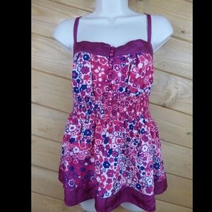 This is a beautiful all silk, vibrant floral print cami top with a stretchy elastic waist in the front and sides and a silk sash that can be tied in the front or back. Tiny buttons with fabric loops line the bust area. So very pretty and perfect for summer parties.