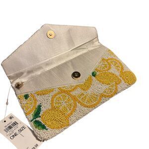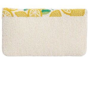 Chic and vibrant, this lemon-themed beaded clutch is perfect for adding a pop of color to any outfit. The intricate beadwork features bright yellow lemons on a cream background, making it a standout accessory for any occasion.