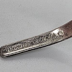 Silver tone (probably silver plate? I don't think it's full sterling) repurposed silverware cuff made from Oneida silverware. Has some tarnishing, that can be polished depending on the aesthetic you want. Since it's an open cuff, you can bend it to the size of your wrist as needed.