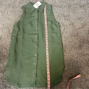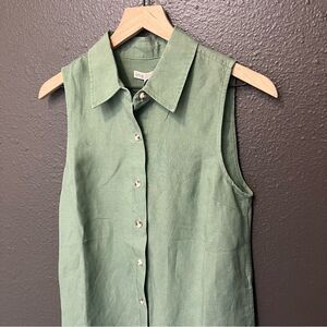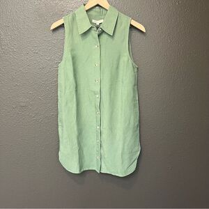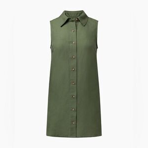 The Air Linen Sleeveless Shirtdress falls to a mini length and features a side seam slits and a front button closure.