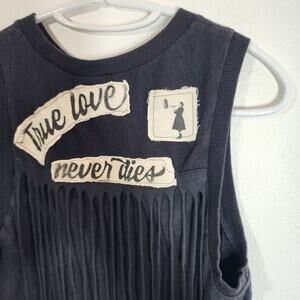 Effortlessly cool with a touch of rustic charm! This black sleeveless tee has been lovingly reworked by me, featuring delicate fringes on the back for a free-spirited look. Unique appliqués, hand-designed using silk screen techniques and dyed in coffee, add an earthy, vintage appeal that makes this piece truly one-of-a-kind.