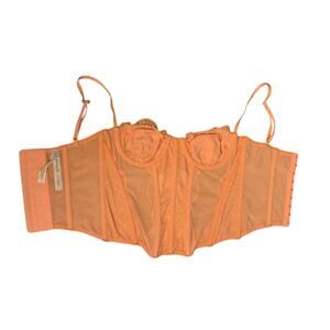 Turn up the heat in this coral lace bustier from Urban Outfitters’ Out From Under collection. This structured corset features delicate embroidered lace panels, a flattering boned bodice, and underwire cups for added shape and support.