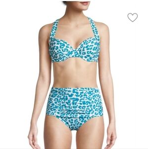 A printed bikini top designed in a bra-like silhouette with underwire cups and crossing back straps. Complete the look with the matching high-waist bottom.