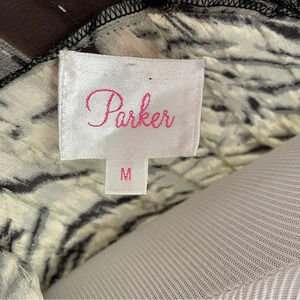Add a touch of wild to your wardrobe with this stunning Parker Gray Animal Print Beaded Long Sleeve Silk Sheer Top. The V-neckline and drawstring closure add a touch of elegance to this blouse, making it perfect for any occasion, whether it's a party, cocktail event, business meeting, or casual outing. The long sleeves and sheer material make it perfect for any season, whether it's winter, summer, fall, or spring. The colorful animal print and beaded accents make this top a true designer piece. Made from high-quality chiffon fabric, this top is both comfortable and luxurious. Available in size medium, this top is a must-have for any fashion-forward woman.