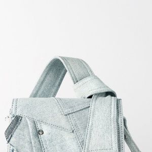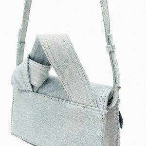 Denim mini city bag with patchwork effect. Handle with knot detail and long crossbody strap.