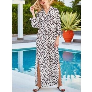 Walk on the wild side this summer in the Peixoto Wild Zebra Josephine Cover Up, featuring a maxi length cover up in a lightweight non stretch gauze fabric with button front detail, collar, long sleeves with tie detail and side slits. One size.