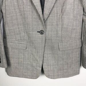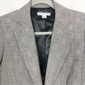 Nice virgin wool blazer by Pendleton. Black and white thin Glen plaid print. Single button front. Three buttons on the cuffs. Great condition! Lined. Womens size 8.