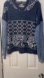 Stylish navy sweater with intricate gray patterns. Features a unique design with mixed textures of sweater and denim. Very comfie. Pit to pit is approximately 27” and length is approximately 25”.