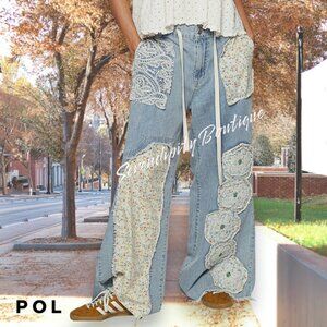 POL Super Baggy Floral Lace Patchwork Faded Oversized Wide Leg Baggy Denim Jeans