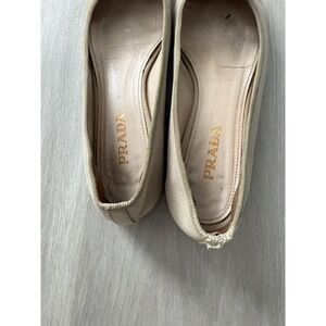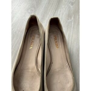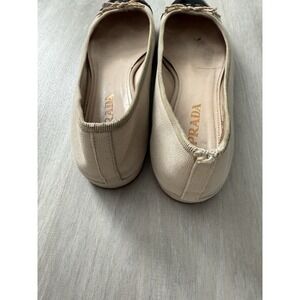 These PRADA Women's Canvas Colorblock Flats Shoes in Size 8.5 are a luxurious designer option for casual wear. The slip-on style features a closed toe and embroidered accents, with a fabric upper and leather insole for comfort. Made in Italy with a solid beige color and blue logo theme, these flats exude a stylish and sophisticated charm. The rubber outsole provides durability, making them a practical and chic addition to any woman's shoe collection.