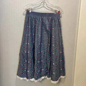 Prairie woman’s blue flower skirt. It’s super cute and has purple and blue and white flowers. It is a size 42. There are no tags on the skirt. It has lace at the bottom of the skirt. The waist is an elastic waist.