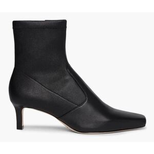 Add a touch of sophistication to any outfit with Annika. This kitten heel ankle boot is crafted from black stretch leather that hugs the leg for a sleek silhouette. Annika is designed with a slightly elongated, snipped square toe shape for a tailored look, a black leather stacked underslung heel, and a tonal inside zipper for easy on and off.