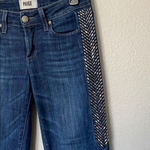 Dark Blue Wash Paige skinny jeans w/ beautiful hip detail. Very flattering on the butt. No missing embellishments.