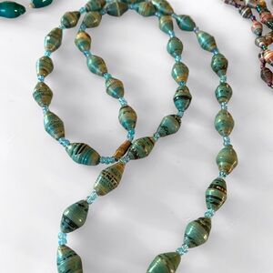 Lot of three vintage paper bead necklaces. One is a triple strand with toggle clasp closure, signed. The other two have barrel clasp closure.