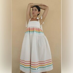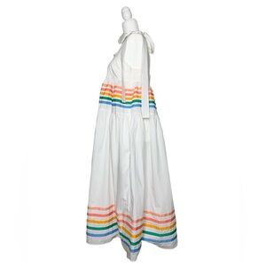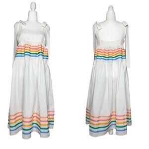 Radiant charm unfolds in this crisp white midi dress, where playful rainbow stripes dance around the bodice and hem, creating an uplifting burst of color. Featuring charming tie straps that allow for a custom fit and add a touch of whimsy to the square neckline, the dress cascades into a breezy, tiered skirt that promises both comfort and style. The design exudes effortless sophistication, making it an ideal choice for sun-drenched afternoons, casual garden parties, or relaxed vacation getaways.