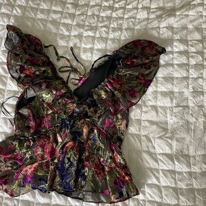 Chic ruffle blouse with a deep V-neck. Features a vibrant multicolor floral pattern. Ideal for stylish outings.