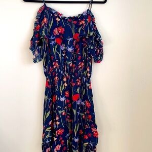 Parker Kam Midi Silk Dress Gardenia Floral Cold Shoulder Ruffle Small