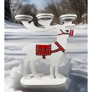 From PartyLite, this is a Nordic look Christmas Winter tealight holder candelabra. I grabbed this because it reminded me of my Swedish roots. Holds 3 tealights, stands approximately 7" tall and 5 3/4 wide. Has a few nicks of paint loss if closly inspected but in otherwise good condition.