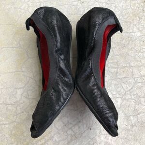 Pas De Rouge Shoes Peep Toe Wedges black nubuck suede leather. Slip on style. Elastic trim on the edges. 1.5” wedge heels.