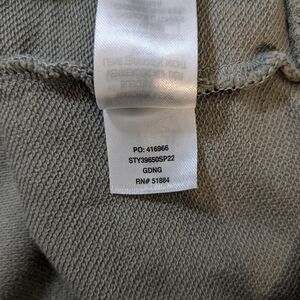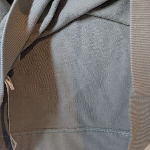 Size SM. Relaxed, slightly oversized fit. Has stretch. Sturdy material. Smooth and soft exterior. Rigid terry cloth interior. Sage color with blue trim.