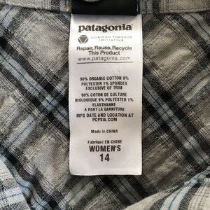 Patagonia woman's gray and blye plaid organic cotton button down shirt. Shirt is long sleeve with button cuffs and is made of an organic cotton, poly, spandex blend. Shirt is a woman's size 14.