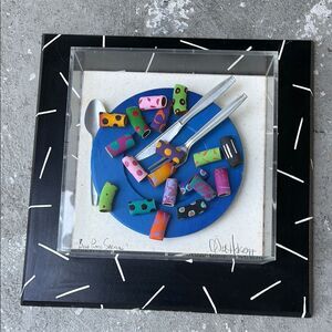 3-D mixed media pasta blue plate special. Please look at the pictures on the bottom side of the black frame needs touchup and the interior shows weathering and I show where there’s scratches in the plastic glass on one side. The black frame measures 16 x 16 and the centerpiece measures 10.5 x 10.5 with a depth of three.