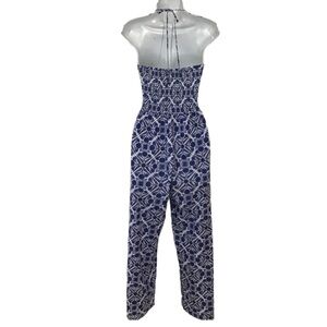Patrons Of Peace Boho Blue White Floral Smocked Halter Jumpsuit Size XS …
