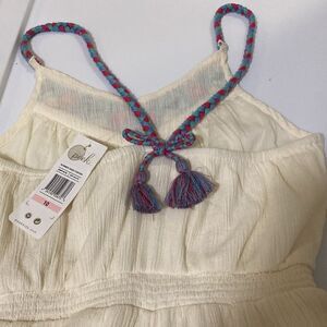 Peek NWT girls Aren’t You Curious embroidered romper in off white crinkled cotton. Features V neck with braided tie straps, sleeveless, side pockets, colorful embroidered details, elasticized waist & fully lined.