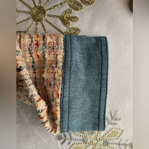 jacket with. combination of fabrics and textures. new and in pink, beige, black and gold with medium blue denim. new with tag