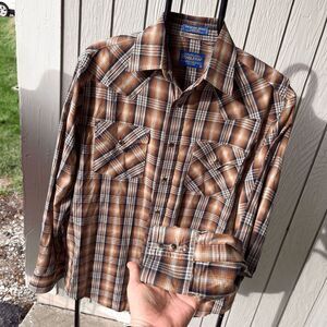 This Pendleton Frontier shirt features a timeless Western plaid design in shades of brown, yellow, and blue. Crafted from a cotton-polyester blend, it includes snap-button closures, two front chest pockets with flaps, and iconic Western yoke details on both the front and back. This classic piece is perfect for casual wear, outdoor activities, or rugged workwear styling. This shirt is likely vintage, but it is hard to tell as Pendleton's classic styles and above-average craftsmanship continue to this day.